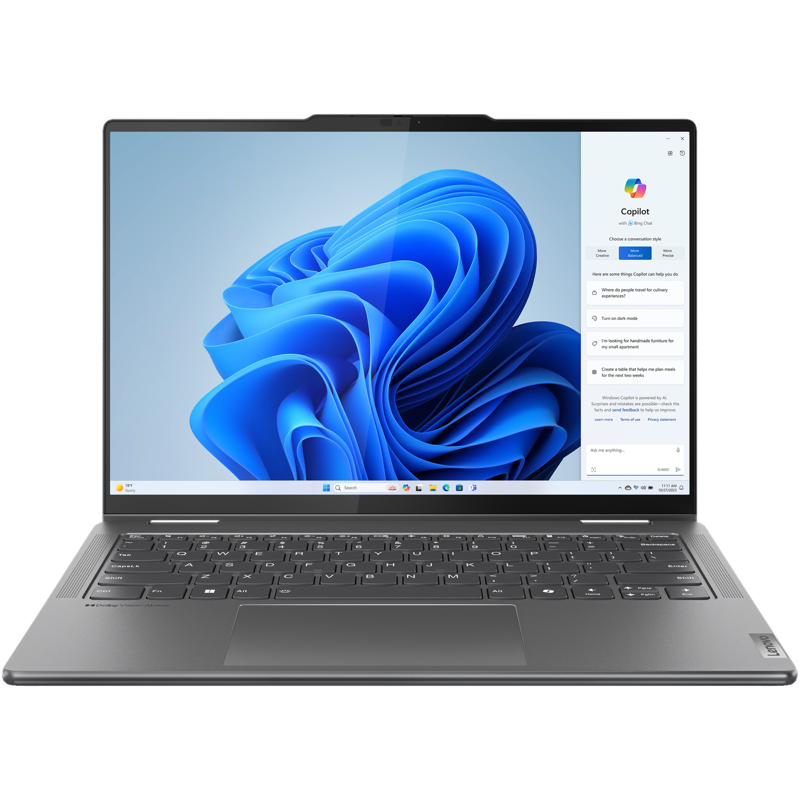 Lenovo Yoga 7 2-in-1 14" on monipuolinen kannettava tietokone, jossa on eloisa OLED-kosketusnäyttö, tehokas Intel Core Ultra 7 155H -suoritin, 16 Gt RAM-muistia ja tilava 1 Tt:n SSD-levy, joka on suunniteltu sekä tuottavuutta että viihdettä varten.