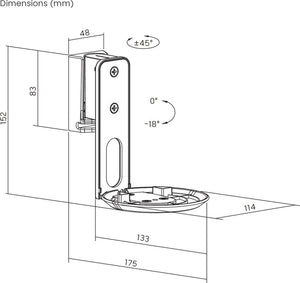 Flexible Adjustment Options: To optimize your room's acoustics, our wall mount offers a tilt range of 0° to -18° and a swivel range of +45° to -45°. This allows you to precisely adjust the speaker's angle and direction to suit your needs, ensuring the best sound experience wherever you are in the room.